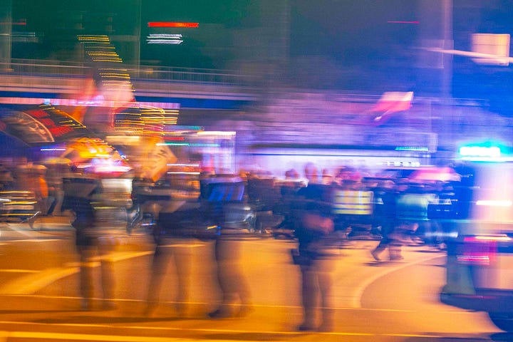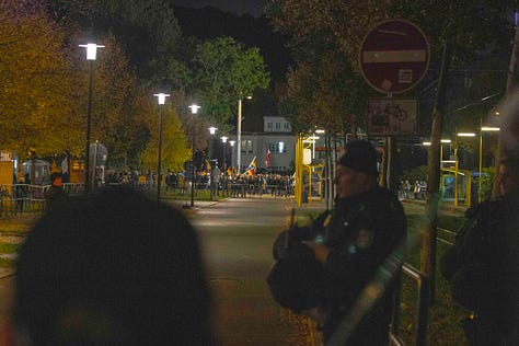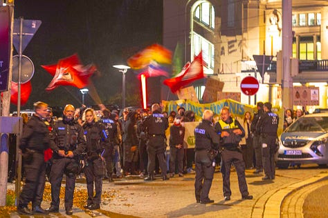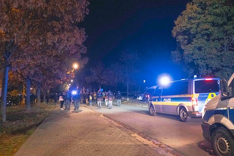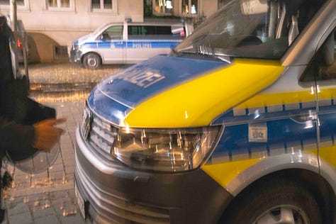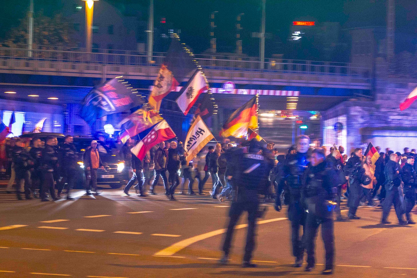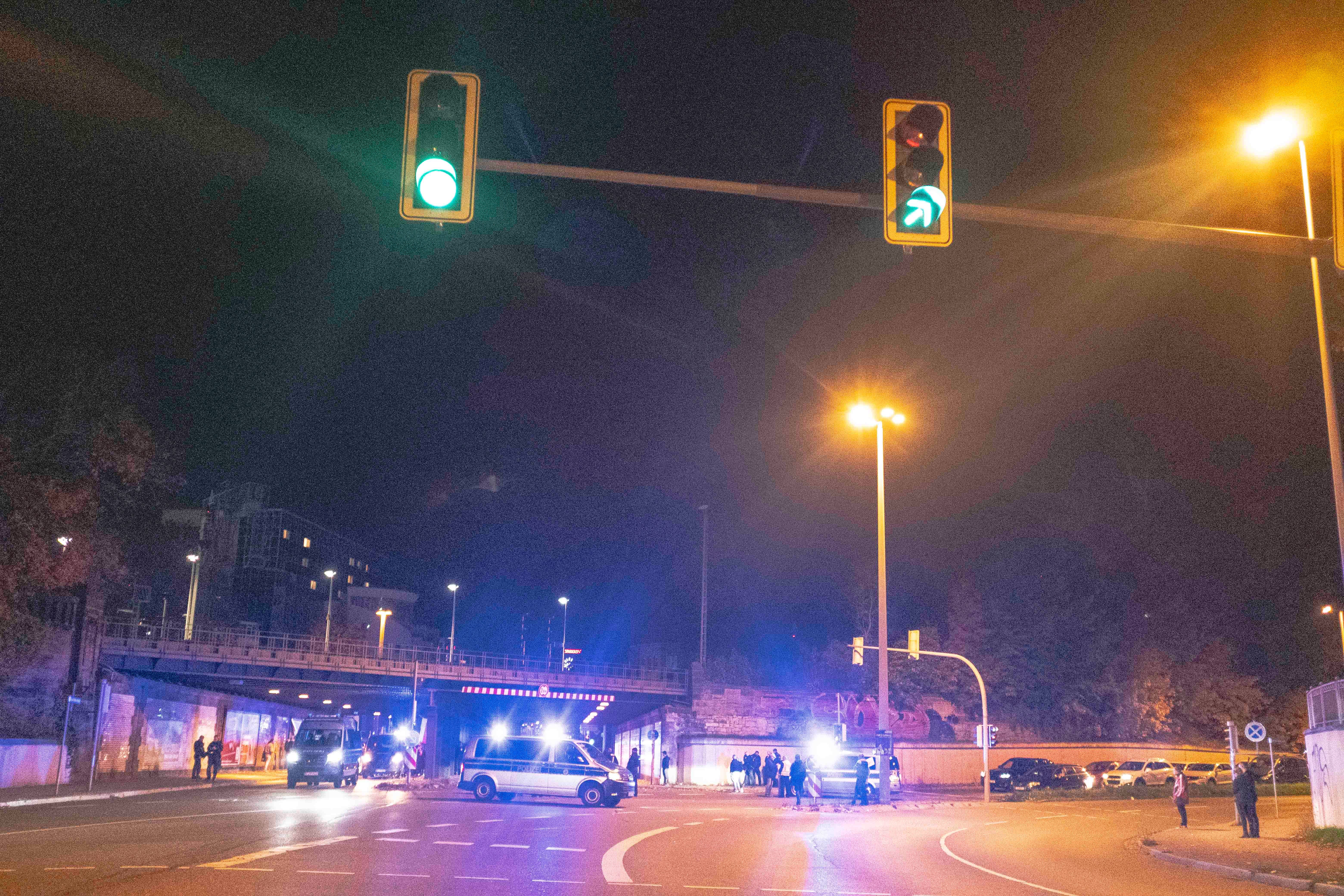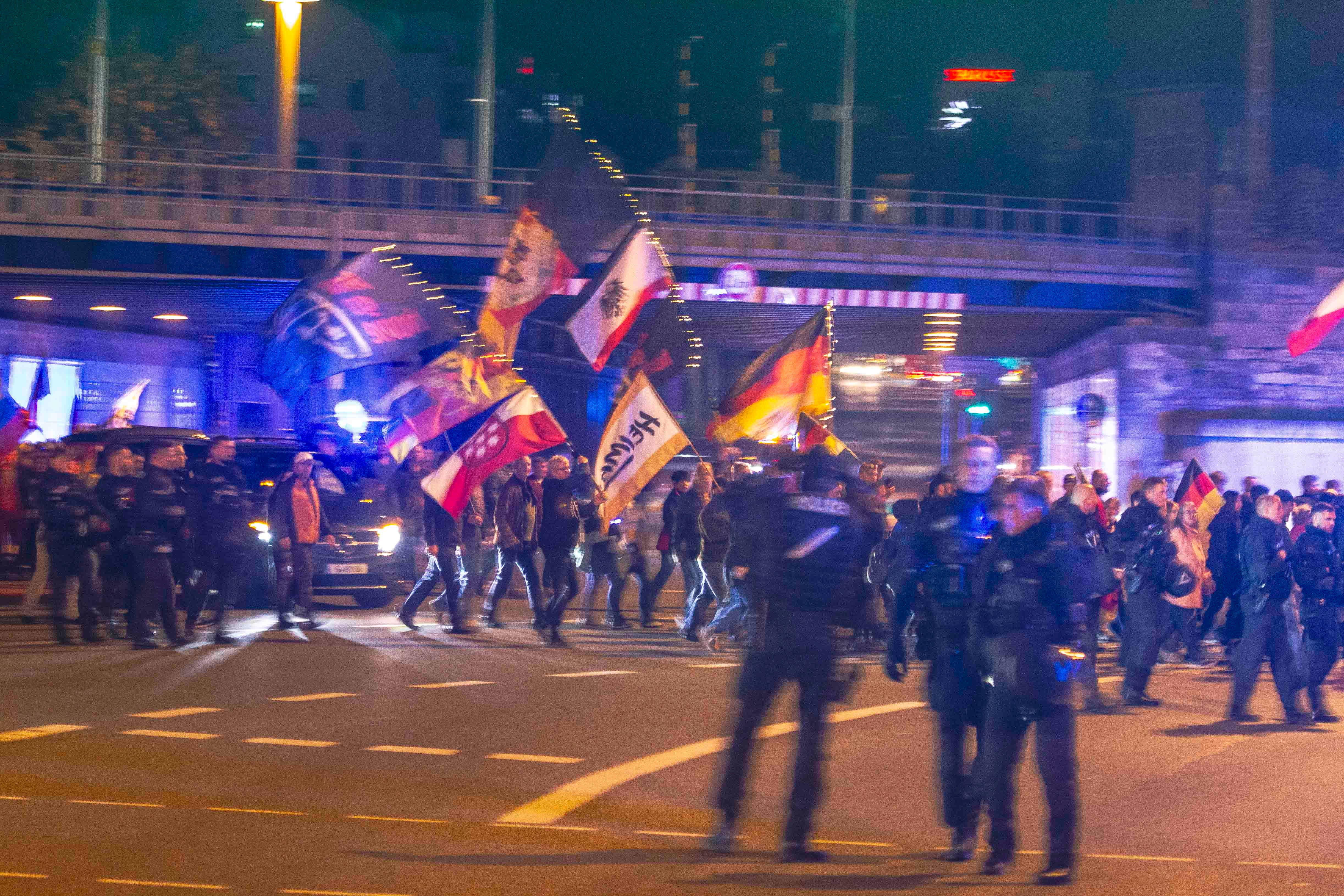 Doch bis dahin schafften sie es nicht. Als die Demonstration auf der Ernst-Toller-Straße in die Bahnunterführung lief und damit in Sichtweite der demokratischen Versammlungen kam, fingen sie wieder mit Trommeln an. Die Polizei stoppte die Demo erneut und nahm die Trommler, darunter mindestens ein bekannter Reichsbürger, in eine Maßnahme. Am Abend nach der Demo vermeldete die polizeiliche Pressestelle: „zwei Anzeigen wegen des Verstoßes gegen § 86a StGB, eine Beleidigung zum Nachteil eines Medienvertreters, einen Widerstand gegen Vollstreckungsbeamte sowie sechs Verstöße gegen das Versammlungsgesetz (u. a. Vermummungsverbot, Auflagenverstoß)“.