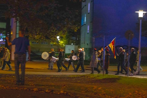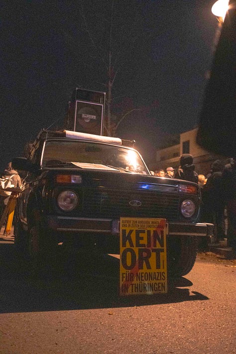 Die Stimmung in dem nicht angemeldeten Aufzug des rechten Lagers war schon von Beginn an recht aggressiv. Sie zogen los, an den Prinzenhäusern vorbei über die Neue Straße Richtung Gebrüder-Häußler-Straße. An der Panndorf-Sporthalle stoppte die Polizei die Demo. Es gab die zusätzliche Beauflagung, das Trommeln zu unterlassen. Unter großem Protest gab man sich der Auflage hin. Demo-Anführer Christian Klar, vorbestrafter Rechtsextremist aus Gera, rief durchs Mikro, dass die Trommler die Demo am Pavillon „mit einem riesigen Trommelkonzert“ empfangen sollen.