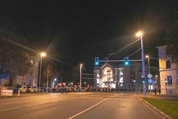 Die beiden anderen Kundgebungen verliefen störungsfrei. Auch der Straßenbahnverkehr wurde nur geringfügig behindert. Auf der wöchentlichen Versammlung des Aktionsbündnisses konnte man sein Statement gegen Hass aufschreiben oder verkünden. Mithilfe von Polyluxen wurden außerdem Botschaften an die Wand des Theaters projiziert. Auf der Antifa-Kundgebung in der Parkstraße gab es zudem einige Redebeiträge und auf beiden Versammlungen wurden warme Getränke verteilt.
