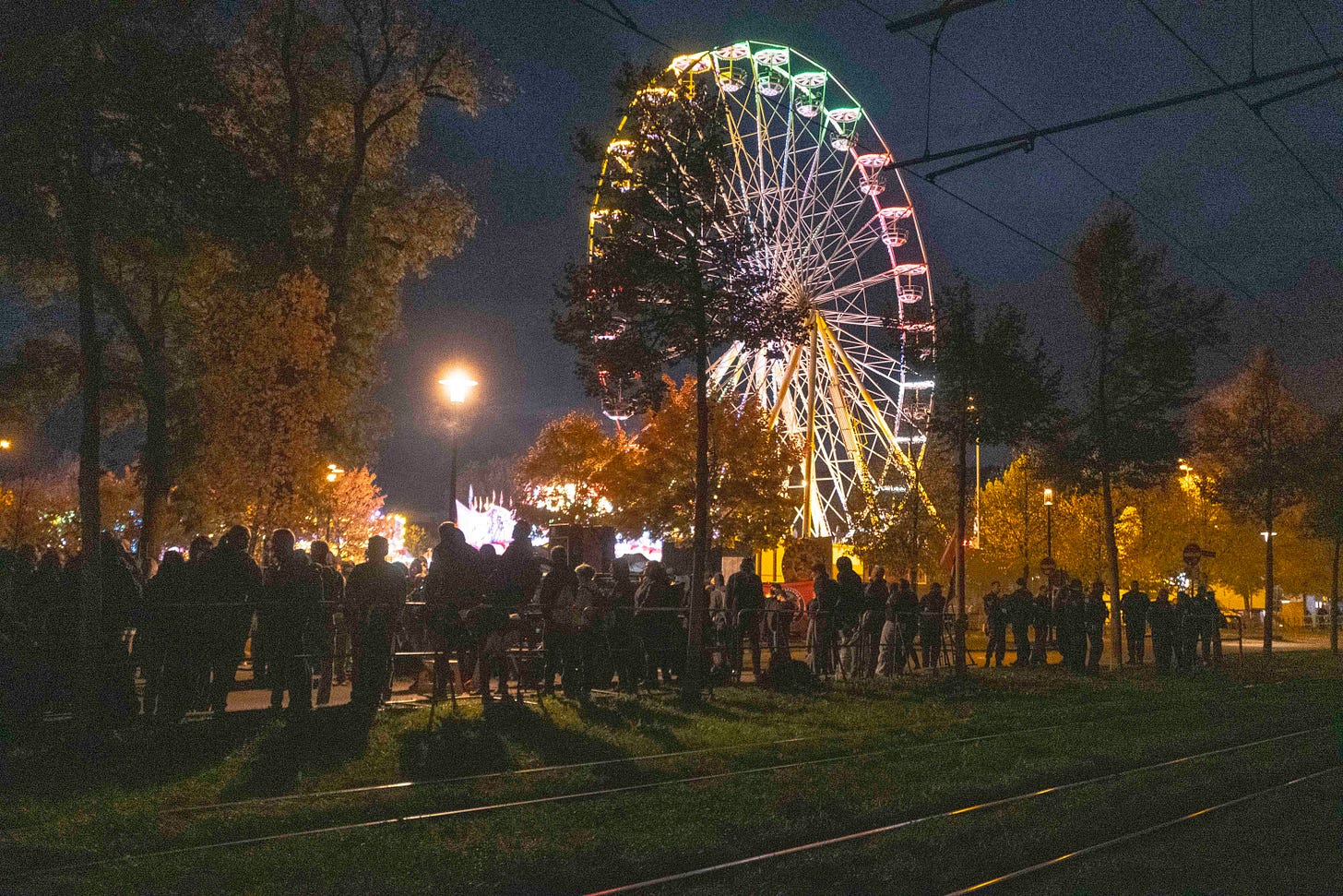 Am vergangenen Montag konnten die Montagsdemonstrant*innen ihre Demo, bei der sich besonders Rechtsextremisten und Reichsbürger*innen hervorheben, nicht in ihrer gewohnten Routine abhalten. Nachdem sie schon den Platz vor dem Theater, lange Zeit Ort ihrer Endkundgebungen, an den wöchentlichen Versammlungen des Aktionsbündnisses Gera gegen Rechts verloren haben, mussten sie sich in dieser Woche auch einen anderen Startplatz aussuchen. Normalerweise sammeln sich auf dem Hofwiesenparkplatz an der Ecke Küchengartenallee/Parkstraße. Durch das Herbstvolksfest, welches vom 19. Oktober bis zum 3. November stattfindet, ist der Parkplatz in weiten Teilen belegt. Außerdem gab es eine zweite angemeldete Versammlung im Bereich der Kreuzung Küchengartenallee/Parkstraße. Zu dieser Versammlung riefen die Antifa Aktion Gera (AAG) und andere antifaschistische Aktionsgruppen aus Thüringen auf. Die Polizei sperrte die Parkstraße großzügig mit sogenanntem Hamburger Gitter ab und hielt Personen vom Betreten der dortigen Straßenbahngleise ab. So versammelten sich die Rechten am Pavillon gegenüber der Orangerie.
